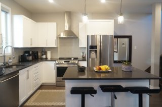La cuisine se veut à la fois élégante et fonctionnelle avec son grand îlot central, ses comptoirs de quartz d'un pouce d'épaisseur, ses portes et tiroirs avec amortisseurs ainsi que son rétroéclairage sous les armoires créant une ambiance chaleureuse en soirée. Une salle d'eau pratique complète ce niveau, évitant les allers-retours vers les étages pour les invités.